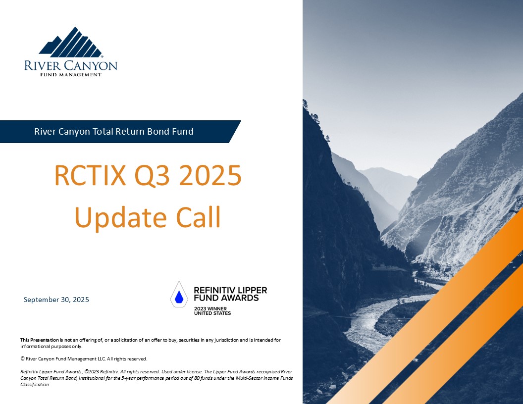 Morningstar Rating™ as of 30 September 2025 for the Inst. series; other classes may have different performance characteristics. The River Canyon Total Return Bond Fund was rated against the following numbers of Multisector Bond funds over the following time periods: Overall 5 Stars (360 funds rated); 3 Yrs. 4 Stars (360 funds rated); 5 Yrs. 5 Stars (324 funds rated); 10 Yrs. 5 stars (221 funds rated), based on risk-adjusted returns. Past performance is no guarantee of future results. The Morningstar Rating™ for funds, or “star rating”, is calculated for managed products (including mutual funds, variable annuity and variable life subaccounts, exchange-traded funds, closed-end funds, and separate accounts) with at least a three-year history. Exchange-traded funds and open-ended mutual funds are considered a single population for comparative purposes. It is calculated based on a Morningstar Risk-Adjusted Return measure that accounts for variation in a managed product’s monthly excess performance, placing more emphasis on downward variations and rewarding consistent performance. The top 10% of products in each product category receive 5 stars, the next 22.5% receive 4 stars, the next 35% receive 3 stars, the next 22.5% receive 2 stars, and the bottom 10% receive 1 star. The Overall Morningstar Rating for a managed product is derived from a weighted average of the performance figures associated with its three-, five-, and 10-year (if applicable) Morningstar Rating metrics. The weights are: 100% three-year rating for 36-59 months of total returns, 60% five-year rating/40% three-year rating for 60-119 months of total returns, and 50%10-year rating/30% five-year rating/20% three-year rating for 120 or more months of total returns. While the 10-year overall star rating formula seems to give the most weight to the 10-year period, the most recent three-year period actually has the greatest impact because it is included in all three rating periods. © 2024 Morningstar. All Rights Reserved. The information contained herein: (1) is proprietary to Morningstar and/or its content providers; (2) may not be copied or distributed; and (3) is not warranted to be accurate, complete or timely. Neither Morningstar nor its content providers are responsible for any damages or losses arising from any use of this information. Morningstar’s percentile ranking is based on the highest (or most favorable) percentile rank of 1 and the lowest (or least favorable) percentile rank of 100. Past performance is no guarantee of future results.